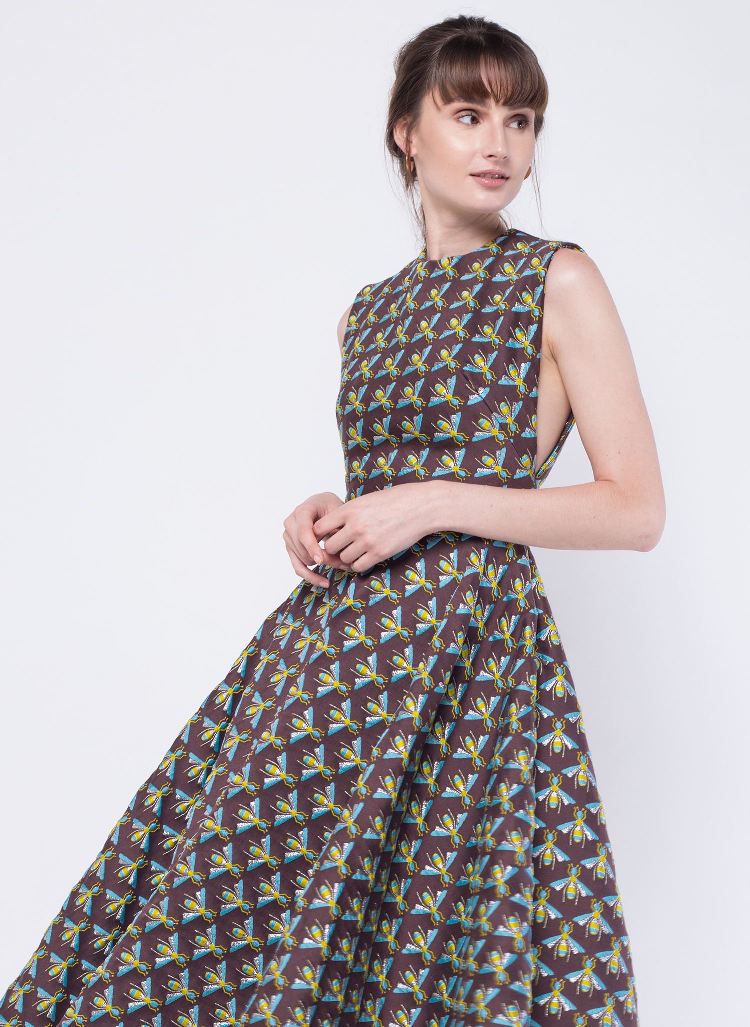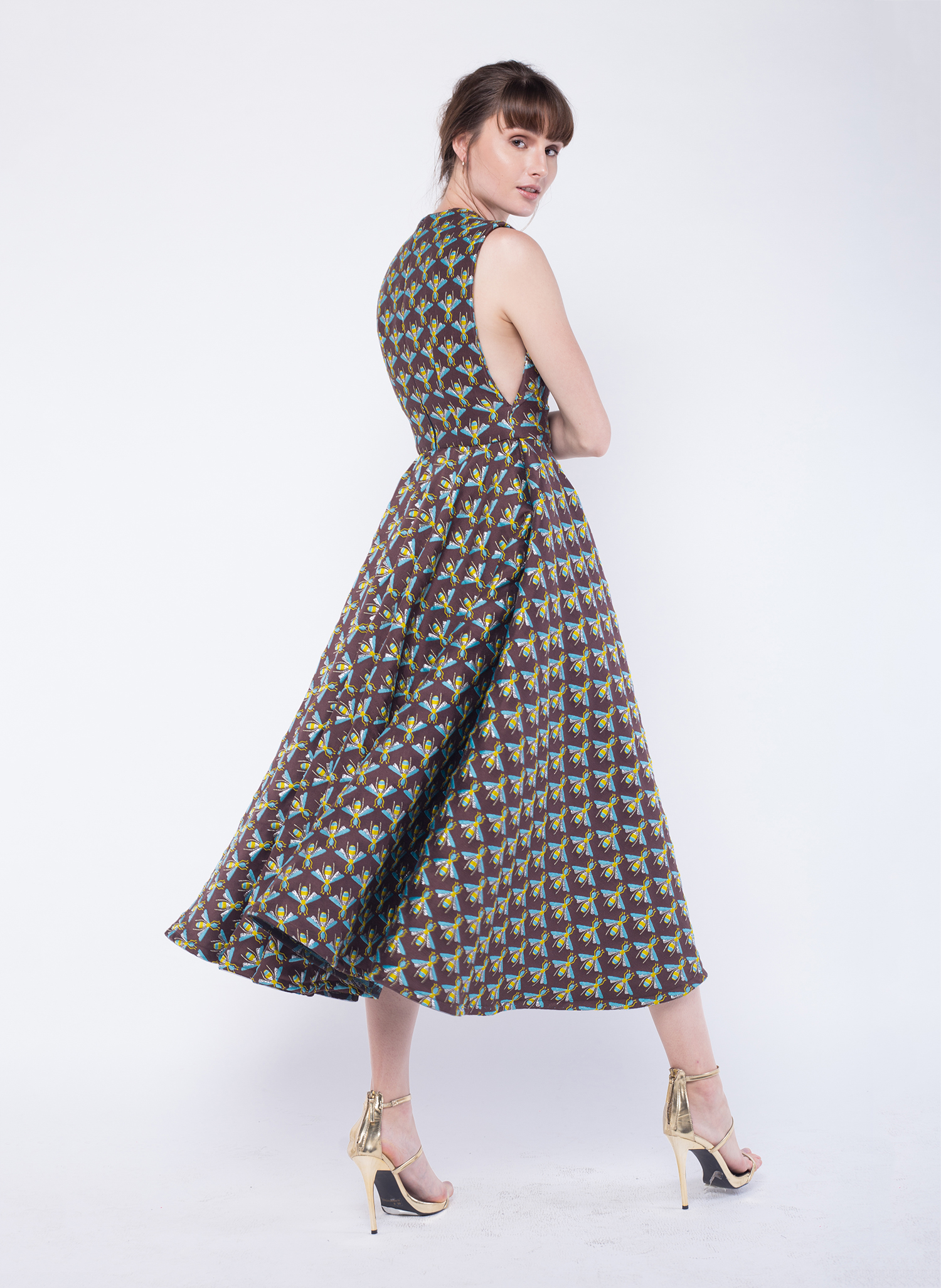 The Abeja Brocade Dress is easy to style and work for any time of day. This bee patterned midi dress is made from a lurex blend brocade and cut with a full circled skirt. Wear yours with barely-there sandals and a basket bag.