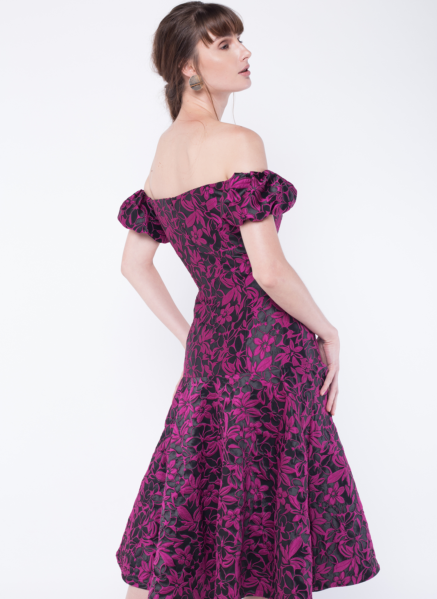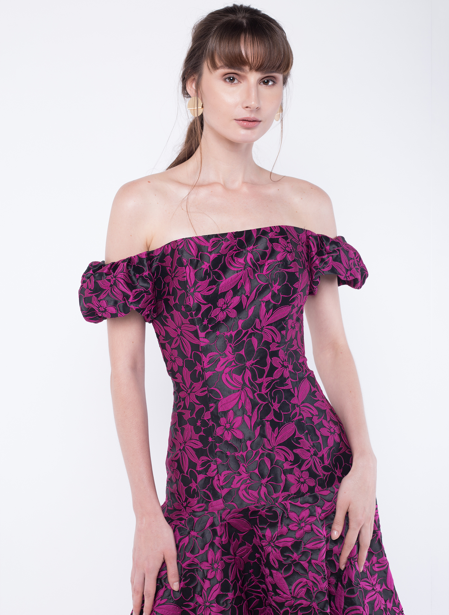 This Asteria Brocade dress is printed with the flower asetria. It has romantic puff sleeves and a ruffled skirt that moves in the most elegant way. The off-the-shoulder neckline accentuates the decolletage. It is wise to style with the hair tucked in a bun.