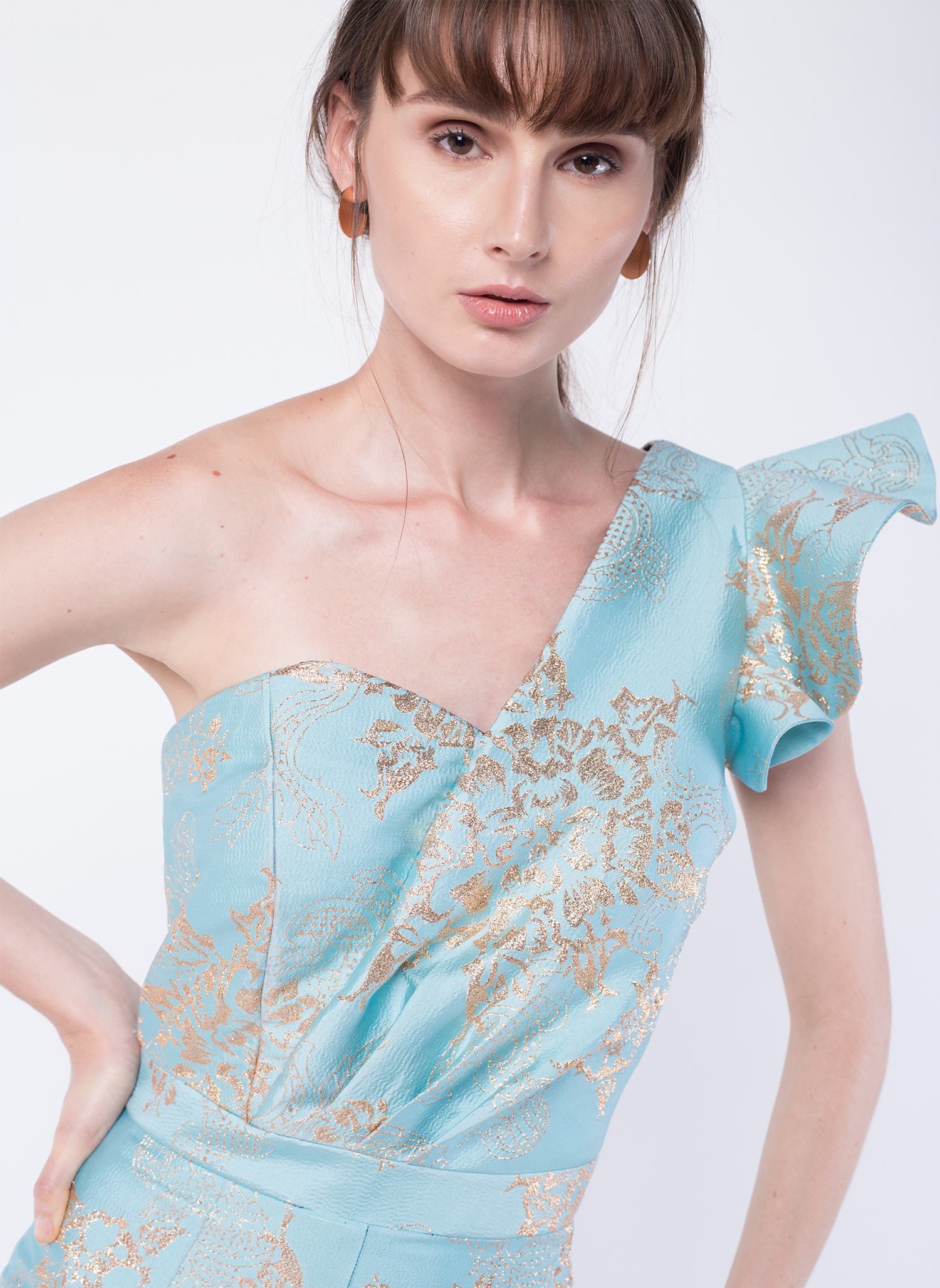 Cut from a blue lurex-blended brocade fabric, this style is designed with a bustier top and straight-cut pants. It has a pleated one shoulder top with ruffled sleeve.