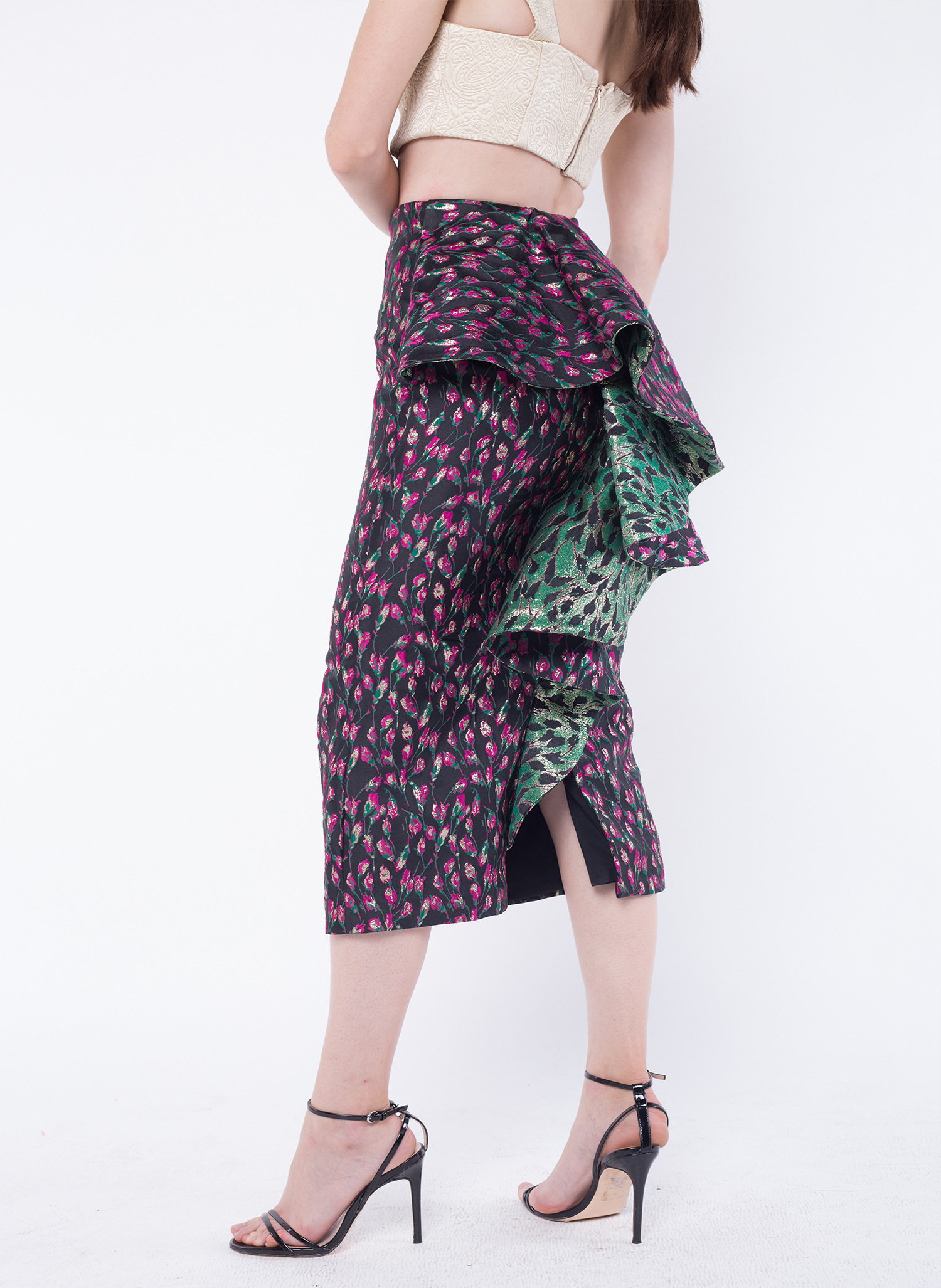 Made from multicolor lurex blended brocade, it’s cut in a slim pencil silhouette with ruffles at the back going down from the hip to the back. The back slit makes it easy to move around in, too. Wear yours with a bustier or a crisp white polo shirt for a formal look.