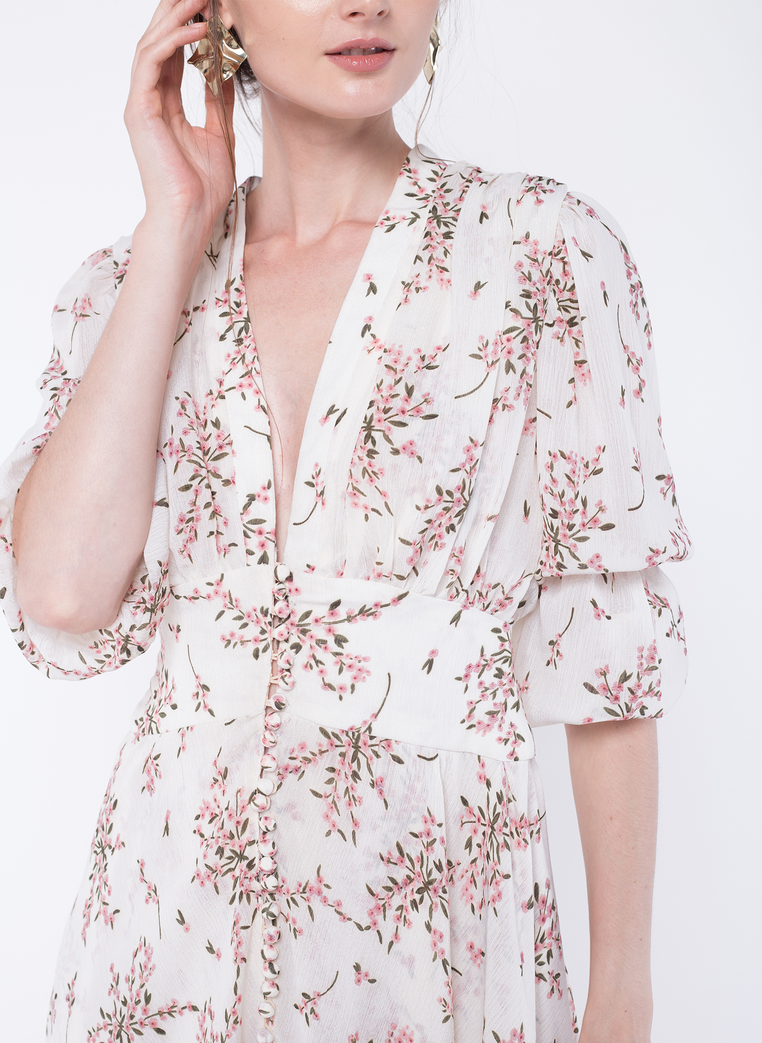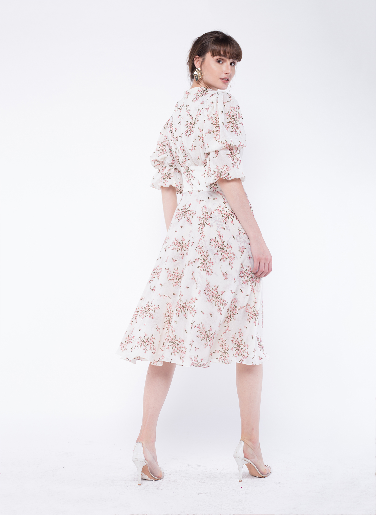 This summer inspired Midi Dress is made from a pink floral georgette fabric draped to create an elegant silhouette.