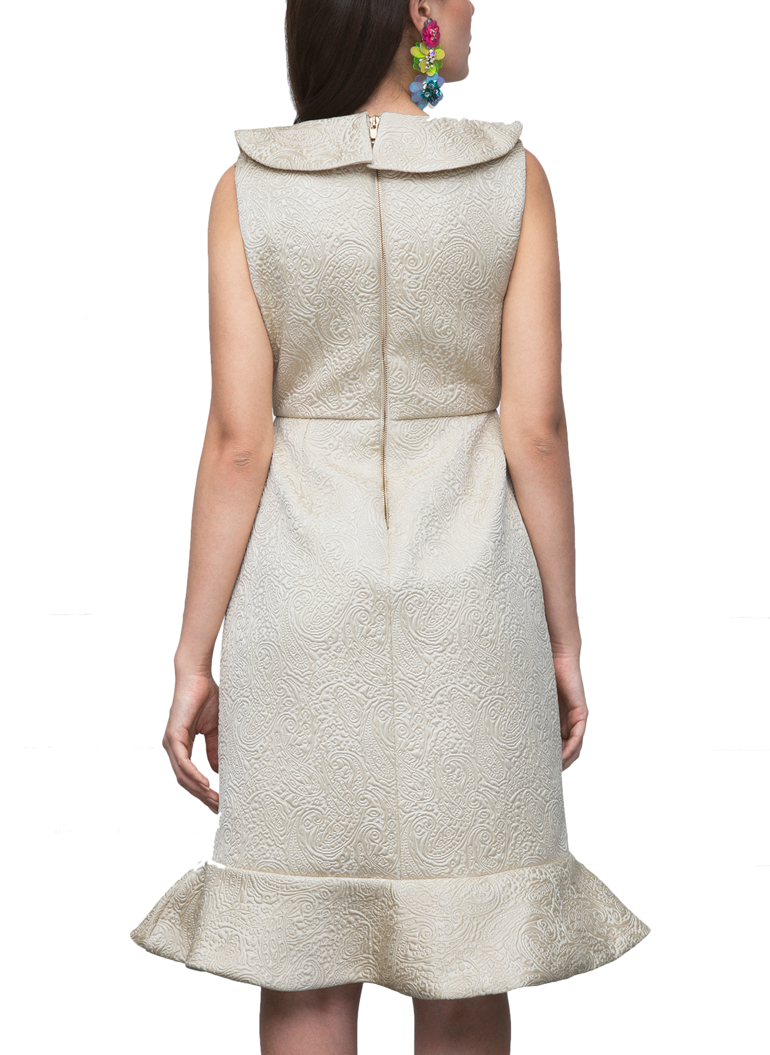 This dress is cut from cotton matelassé and features a ruffled peter pan collar and flounce at the hem. Fastens at the back with an exposed zip.