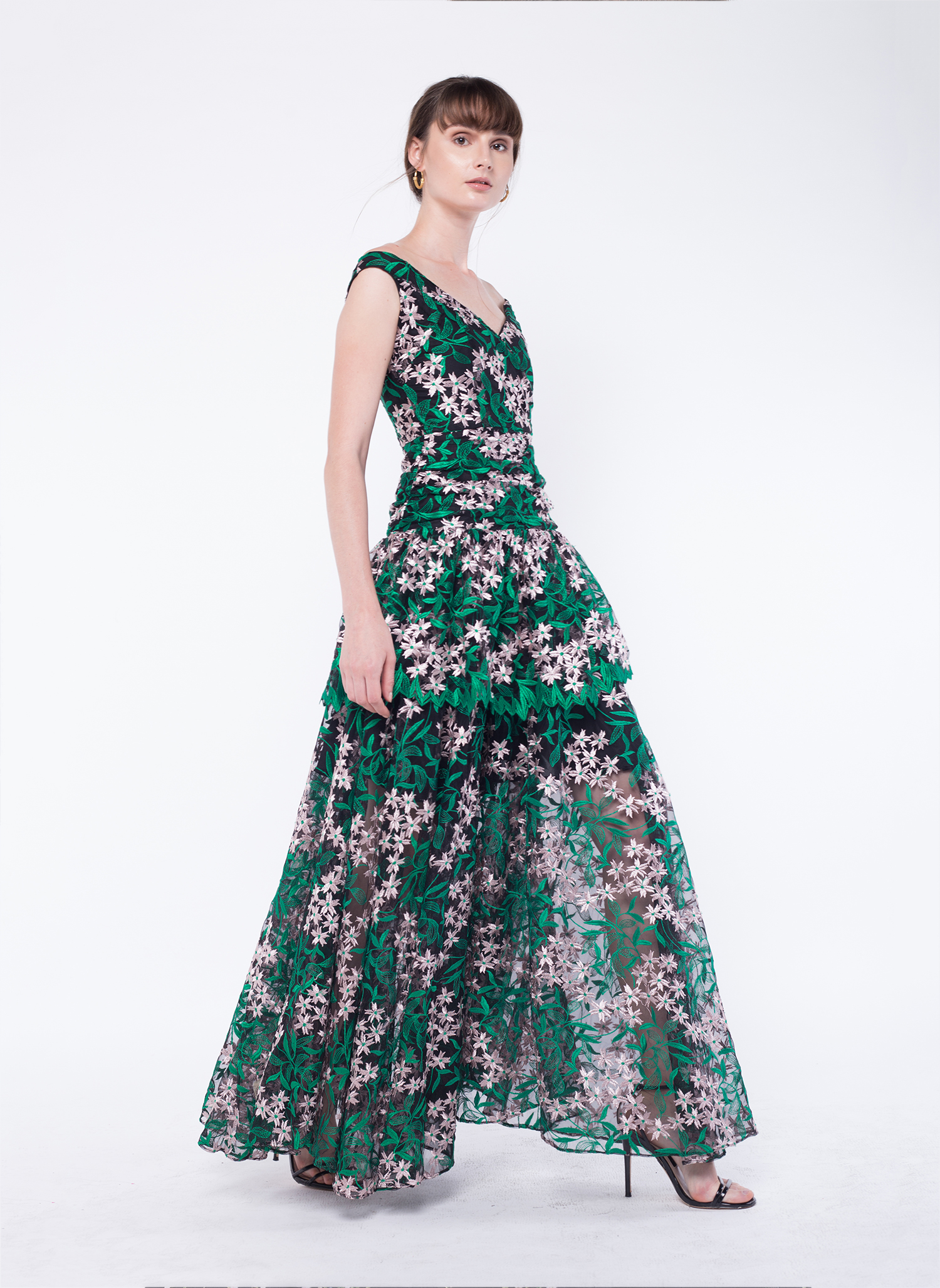 Inspired by the Tuileries Garden in Paris, this dress is a standout in any garden party. It features an overlap bodice with a gathered panel at the hips, and a two-tier skirt.